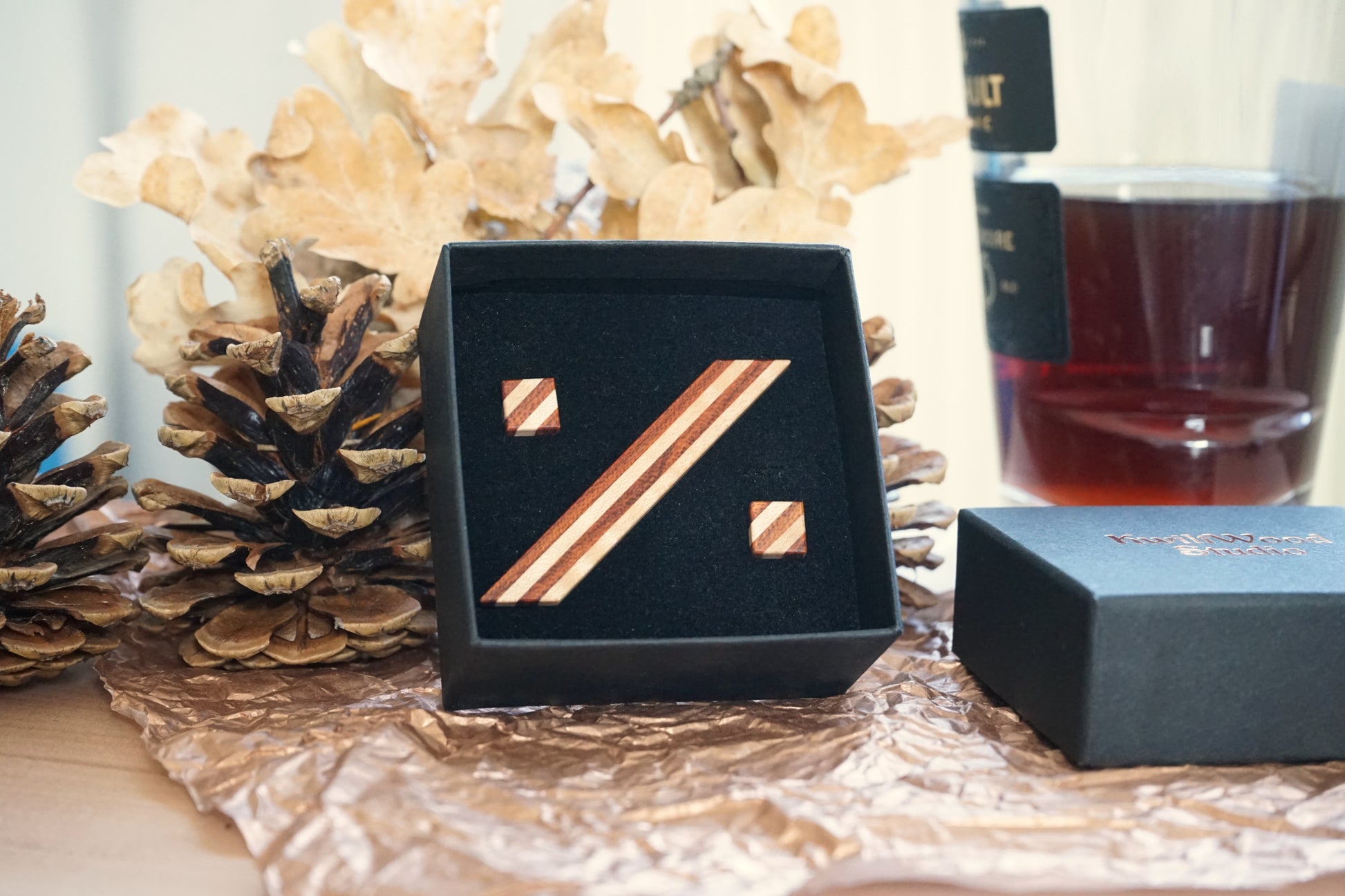 ► A wooden jewelry set of a tie bar and a pair of matching earrings that shine beautifully, thanks to the exquisite pattern of the wood itself. The patterns of maple and bloodwood complement each other perfectly.