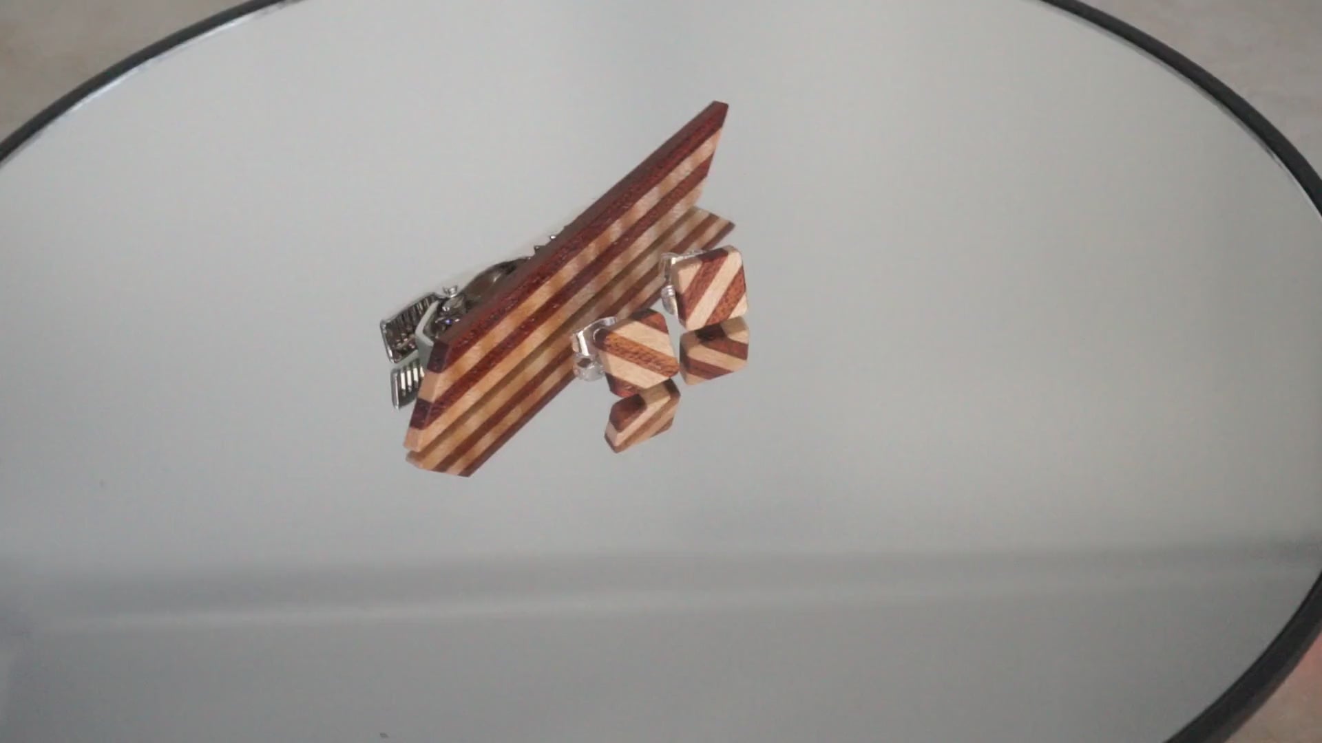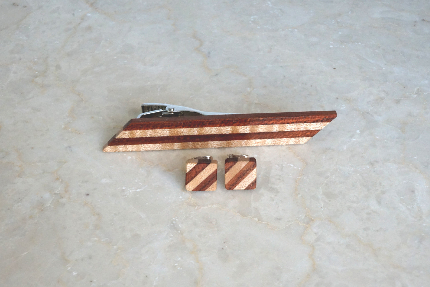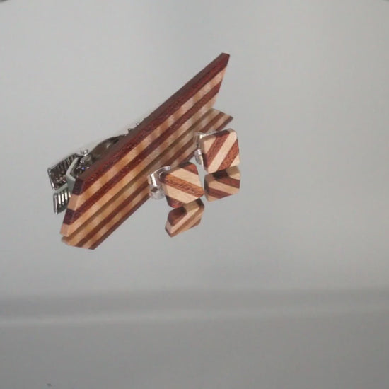 ► Material: Maple, bloodwood, stainless steel (tie bar), silver coated brass (earrings)